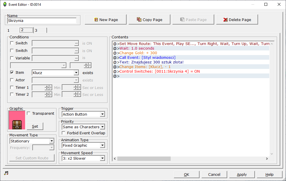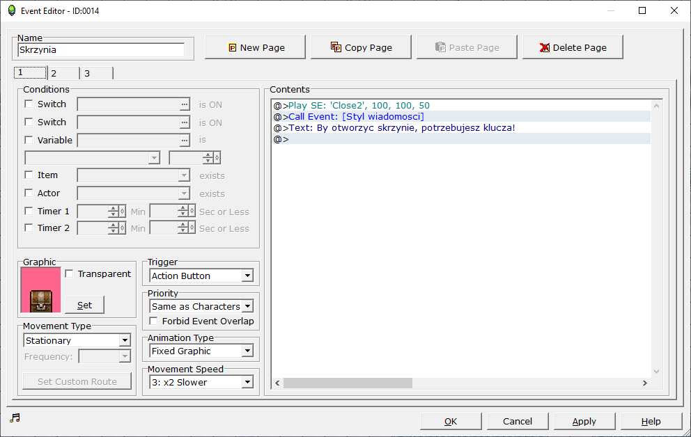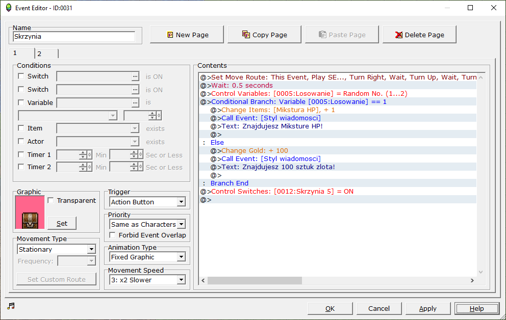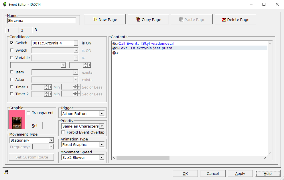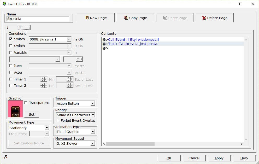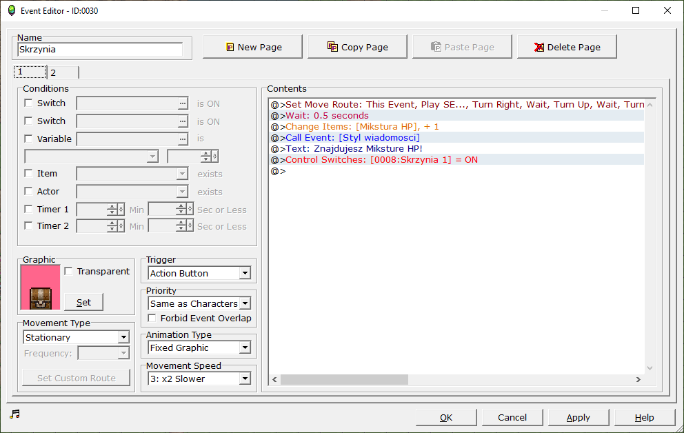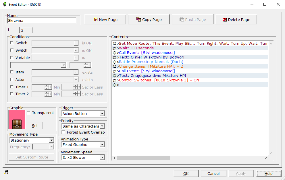 Praktyczne zajęcia zaczniemy od stworzenia standardowej skrzyni ze skarbem, którą umieścimy gdzieś na mapie wioski. Ustawiamy jej grafikę z charsetu Object1, Trigger zostawiamy na Action Button, Priority na Same as Characters. Bardzo ważne jest to, by w Animation Type ustawić Fixed Graphic!