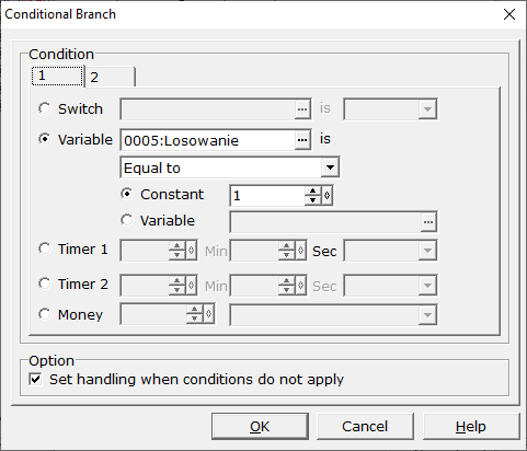 Ustawmy w polu Variable zmienną, której użyliśmy do losowania, w Constant wpisujemy 1 i zaznaczamy pole w sekcji Options na dole. Zatwierdzamy OK. Dzięki temu zażądaliśmy, by program sprawdził, czy zmienna Losowanie jest równa 1, czy też nie. Jeśli jest, wykonane zostaną komendy znajdujące się bezpośrednio pod napisem Conditional Branch: Variable [0005:Losowanie] == 1. Jeśli natomiast zmienna ma inną wartość, wykonane zostaną komendy znajdujące się bezpośrednio pod napisem Else. Niezależnie od tego, która opcja została wylosowana, komendy dalej będą się normalnie wykonywać po napisie Branch End.